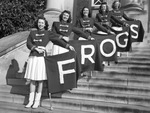 The Froggie Flag Twirlers are the latest addition to the Texas Christian University band. Posed on the steps with their flags, left to right, are Betty Lou Hitson (Houston, Texas), Marion Graham (Beaumont, Texas), Billie Louise Rippeton (Fort Worth, Texas), Betty Benton (Rusk, Texas), and Jean Hill (Spearman, Texas). The Twirlers will make their debut against the Houston Owls Saturday afternoon. The girls are dressed in band uniforms and spell out "Frogs" with their flags.