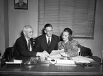 Fort Worth Red Cross First Aid Committee members Fire Chief Ligon (left), Police Chief Dysart and Mrs. Ted Samosch. The trio is shown sitting at a desk, discussing over plans for training courses for firemen and policemen. Each of them are holding a paper clipped document and reading over it. Ligon and Dysart are dressed in dark suits with neckties and Mrs. Samosch is wearing a highly patterned jacket with a beaded beret. The men are also wearing eyeglasses. Other than the planning documents, there are two ash trays and a few fountain pens scattered about, as well. Behind them is a wall with a closed window.
