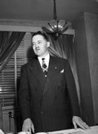 Shown here is Judge E. W. Frost. He is a municipal court judge, Kansas City, Missouri and chairman of the committee of improvement of traffic courts in the American Bar Association. He is in Fort Worth, Texas to discuss a traffic safety campaign recently conducted by the Fort Worth Lions Club. His home city was safest in the nation from 1939 to 1940. However, traffic deaths in 1946 have already surpassed the 1945 total. This increase in consistent with the national increase. Judge Frost is listing ways to improve traffic safety. He is dressed in a double breasted pinstripe suit with a pocket square. Published in the Fort Worth Star-Telegram morning edition, November 26, 1946.