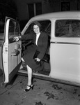 Mrs. Clifford T. Ayres will soon travel to the Philippines to meet her husband, engineer Mr. Clifford T. Ayres. Mrs. Ayres will surprise her husband with the 1946 model car. Both the car and the engineer's wife will travel to the Philippines on a ship. Mrs. Ayres is shown climbing behind the wheel, wearing a hat, blouse, blazer, and a skirt. Her purse is tucked underneath her arm. Published in the Fort Worth Star-Telegram evening edition, November 26, 1946.