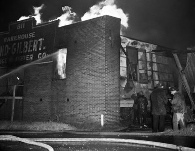 Image shows A three alarm fire destroyed a warehouse, damaged two residences, and threatened an oil storage company. The blaze began at 10:20 p.m. and took the firemen over two hours to extinguish. The Market Produce Company and the E. L. White Company occupied the warehouse where the fire began. According to Fire Chief Coy C. Killian, their estimated loss was around $5,000. Three firemen are standing around the side of the warehouse. They are spraying a water hose into the smoke filled building. The sheet metal outside the building is bending from the flames. Flames engulfed the roof and the intense blaze can be seen through the window. Two more firemen are standing at the front of the warehouse talking to a civilian. The fire was discovered by Richard Applewhite, night manager of the Joyce Oil Company, which escaped damage. There were 32,000 gallons of oil and 24,000 gallons of kerosene stored in their building. Published in the Fort Worth Star-Telegram morning edition August 1, 1940.