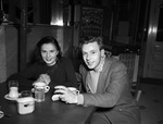 Mr. and Mrs. J. J. Claes are stopping in Fort Worth on their way to Marfa, Texas. The couple moved to Texas from Blankenberge, Belgium. They are shown drinking a cup of coffee at the Southwest Motor Club. Some of the other patrons are giving the couple advice about visiting a ranch. Mrs. Claes is wearing a dark sweater. Mr. Claes is dressed in a collared shirt, sweater, blazer, and trousers. He is holding a cigarette in his left hand. Published in the Fort Worth Star-Telegram morning edition, November 27, 1946.