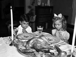 Linda Telford, 5, and Jimmy Hart, 5, saying grace at a Thanksgiving dinner. The clipping reads, "Dubs on That Drumstick (Both, if Possible) -- Fall's great moment comes Thursday--Thanksgiving's big dinner of turkey, pumpkin pie, and giblet gravy that will reunite families all over the nation, prepare thousands for an afternoon of football cheering, lead other thousands to spoken and silent prayer for the good things. But to no one does it have greater meaning that to the kids--the demure young lady, the anxious young man. The children are Linda Telford, 5, daughter of Mr. and Mrs. Carl Telford of 1416 Byrd, and Jimmy Hart, 5, son of Mr. and Mrs. George Hart, of 3147 Cockrell." Published in the Fort Worth Star-Telegram morning edition, November 28, 1946.