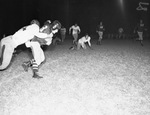 The Thanksgiving Night Classic high school football game is being held at Farrington Field in front of a crowd of 25,000. The undefeated North Side Steers (white jerseys) are taking on the Paschal Panthers. After a punt from the Steers, Panther back Dickie Durham returned the ball thirteen yards. He is being stopped by the big Steer tackle, Bob Vann. The Steers went on to win the game 14-13, staying perfect on the season.