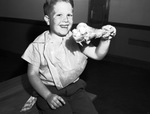 Seven-year old Lynn Mayfield is ready to celebrate Thanksgiving. He is pictured with a napkin tucked in the collar of his shirt as he chows down on a big turkey drumstick. He is the son of Mr. and Mrs. Loyd Mayfield. Lynn is sitting on a bench, dressed in a short-sleeve shirt and trousers. Published in The Fort Worth Star-Telegram Evening Edition November 28, 1946.