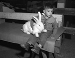 The Texas State Rabbit Breeders Association is holding a four-day event at Will Rogers Memorial Coliseum in Fort Worth, Texas. Posing with one of the rabbits is Thomas Edwin Athens. He is the three-year old son of Mr. and Mrs. Marvin Athens. Thomas Edwin has his arm around a giant white Flemish rabbit. He is wearing a collared shirt, sweater, and trousers.