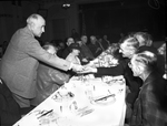 Thanksgiving dinner for News Boys. Amon Carter, left, handing silver dollars to news vendors. Mr. Carter is standing across a long rectangular dinner table with plates of food and drinks on it. He is stretching across giving silver coins to the news vendors that are seated in the table. He is wearing a suit and tie