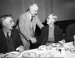 Thanksgiving dinner for News Boys. Amon Carter and news vendors. Mr. Carter is shaking hands with some of the new vendors that are seated at a dinner table with plates of food and drinks in front of them. He is wearing a suit and tie and the unidentified man he is shaking hands with is wearing a suit with an inner collared shirt and no tie while the other man seated beside him is wearing a vest with tie and a suit jacket.