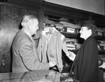 Mrs. Bonnie Lee Hope looks at deluxe cowboy suit shown by Arthur Massey at Washer Brothers department store during Christmas shopping, 11/29/1946