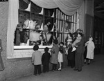Christmas shoppers in downtown Fort Worth and children look at mechanical Santa in holiday decorated window at The Fair department store, 11/29/1946