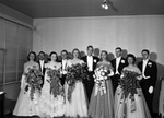 The thirtieth annual Steeplechase Ball is being held at the Blackstone Hotel in Fort Worth, Texas. Five Assembly debutantes are being honored with their escorts. The women wearing their formal gowns, left to right, are Anne Culver, Virginia Robertson, Joann Brown, Alice Belew and Anna Belle Price. The escorts, dressed in tuxedos, left to right, are R. L. Farmer Junior, S. M. O'Brien, Philip K. Thomas and Worley Jones. Published in The Fort Worth Star-Telegram Morning Edition November 30, 1946.