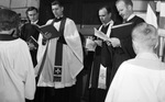The Lutheran Church of Our Savior built a new sanctuary. Prior to opening the doors, the congregation stopped outside to participate in the dedication ceremony. Participating in the ceremony, left to right, are Reverend John Bachman, Karl Bracker, Reverend Carl N. Roth, and Reverend Erling Wold. Reverend Bachman is from Baylor University. He is dressed in a suit and a robe. Reverend Bracker is pastor of the church. He is wearing a white robe and a sash. Reverend Roth is president of the Texas District of the American Lutheran Church. He is wearing a suit, robe, and a sash. Reverend Wold is the pastor of the Trinity Lutheran Church in Fort Worth, Texas. He is also dressed in a robe.