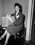 Mrs. Vivian Bryan is reading a letter from her husband, 1st Lieutenant Robert L. Bryan. The letter explains the Lieutenant's plans for his wife to join him in Germany for Christmas. Mrs. Bryan is sitting on a trunk, with a suitcase under her arm. She is wearing a blouse, striped blazer, and a matching skirt.
