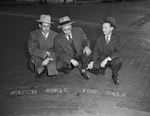The Fort Worth Lions Club is running a Pedestrian Safety Campaign, emphasizing safety through courtesy. Participating in the campaign left to right, are Claud Fleet, Marvin Moore, and Jacques Pierre, chairman of the safety committee. The three men are members of the Junior Chamber of Commerce. They are shown kneeling by a "Watch While You Walk" sign painted on the curb . Mr. Fleet is wearing a hat, suit, and and overcoat. Mr. Moore is dressed in a hat, double breasted suit, and a coat. Mr. Pierre is wearing a hat and a three-piece suit. Published in the Fort Worth Star-Telegram morning edition, December 3, 1946.
