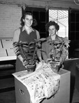 Miss Gwen Brewer (left) and Miss Dolores Linton visit a rabbit farm.