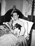 Bill Bumgarner is a wing back on the North Side High School football team. He is a speed specialist for the Steers and the city's leading scorer. Bumgarner is shown laying in bed, eating an apple, and reading a magazine. He is recovering from a throat ailment and plans to return to practice Wednesday. Comforting Bumgarner is his dog "Boots".