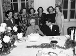Cake; Family members; Suits (Clothing); Neckties; Necklaces; Dresses; Flowers; Candles; Eyeglasses; Coffee Cups; Birthday parties