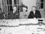 Mrs. W. C. Stripling Sr. birthday dinner at Fort Worth Club. Amon Carter, left, is seated beside Mrs. Stripling, center and an unidentified man at the dinner table. Mrs. Stripling is laughing as the men are having conversations with her. The men are dressed in suits and ties while Mrs. Stripling is wearing a long sleeve dress with a ruffled neck and a flower attached to the right side of her dress at the bust. On the table, there is a leaf design spread down across, and there are tea cups , saucers and glass cups in front of them. In the background, there are windows with curtains