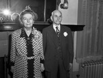 Mr. and Mrs. W. H. V. Yates celebrating their 63rd wedding anniversary. The old couple is shown standing in front of a fireplace together. Mrs. Yates is wearing a dotted, long-sleeve dress that has buttons that run down the middle of it. Mr. Yates is wearing a dark suit with a patterned tie and a small flower pinned near his lapel. Mrs. Yates is looking at the camera and Mr. Yates appears to be looks off to the side. To the left of Mr. Yates is a curtained window with a radiator underneath.