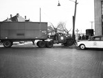 Truck driven by L. V. Thomas, which rolled down a street and ran into a telephone pole. A few people are gathered around the collision. At the right is a Fort Worth Police Department vehicle.