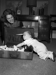 Major Carl B. Johnson is serving with the United States Military in Geissen, Germany. His family will be traveling overseas to spend the Christmas holiday. Mrs. Carl B. Johnson and their young son, Carl Johnson Junior are shown packing for the trip. Carl Jr. is filling his suitcase with some clothes, but mostly toys. He is wearing a short-sleeve shirt and overalls. Mrs. Johnson is sitting on the floor behind the suitcase.