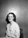 Mrs. R. G. Rector is the president of the Fort Worth Army Air Field Officers' Wives Club. She will preside at a Christmas luncheon on December 17 at the Officers Mess. Mrs. Rector is shown sitting on a chair. She is wearing a button-up blouse, skirt, and three pins.