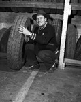 Clyde "Rabbit" McDowell was known as the hustle man of the Fort Worth Cat infield from 1937 to 1942. He is spending the baseball off season working at a tire shop in Fort Worth, Texas. He was removed from baseball during the war when he served with the Army Air Forces. McDowell returned to baseball in 1946 as a player manager with the Class B Circuit. He filled in for the younger players when they were injured. McDowell is planning to spend the 1947 season managing a minor league affiliate of the Chicago Cubs. He is shown at the tire shop, dressed in a hat, jacket, and trousers.