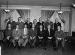 Past presidents of the Advertising Club are being honored at a luncheon Wednesday, at the Blackstone Hotel in Fort Worth, Texas. In attendance, left to right, standing are Thomas L. Yates, Jack Hall, Grover Cole, E. C. Willard, R. C. Rowland, Charles G. Cotton, and Roy G. Tomlinson. Seated in the same order are George Bennett, Homer Belew, Paul Harmon, Curtis Taulbee, Rowland Broiles, C. C. Johnson Junior, and A. E. Hubbard. Published in The Fort Worth Star-Telegram Morning Edition December 5, 1946.