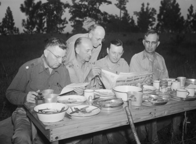 Mock war or real McCoy, soldiering is soldiering just the same. Almost as interested in reading as eating. Left to right, Lieutenant Colonel E. V. Hardwick, Stamford; Captain J. R. Juliusson, Wichita Falls; Lieutenant O. H. Bryant, Abilene; Captain C. H. Brown, Wichita Falls; and Major L. L. Rupert, Beaumont, all infantrymen. All five men are seen around a table eating and drinking, while the four on the right share a newspaper. Lieutenant Colonel Hardwick reads a separate sheet of paper solo.
