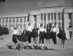 North Side High School cheer leaders (left to right) Hubert King, Vallie Linn Holland, Jack Fowler, Maynette Lawrence, Kenneth White, Pat Lucas, Grady Housenfluck and Lou Ann Fowler.