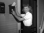 Mrs. Elizabeth Gardner is mailing one last letter to her husband before she sees him in person. Mrs. Gardner will soon join her husband, Lieutenant Edwin I. Gardner in Vienna, Austria where he is stationed with the military. Mrs. Gardner is wearing a collared blouse, dark skirt, and a belt. Published in The Fort Worth Star-Telegram Evening Edition December 9, 1946.