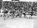 The bi-district high school match-up between the Mineral Wells Mountaineers (dark jerseys) and the Waco Tigers is being held Saturday in Mineral Wells, Texas. The winner of the game will advance to the quarterfinals. Tiger back Lon Griffith is shown running the ball for a ten yard gain. Mountaineer defenders Jack McWhorter (31) and Duane Grissett (41) are making the tackle at the seven-yard line. Several of their teammates are clustered around the play. The run set-up the Tiger touchdown a few plays later. The Waco Tigers went on to win 21-0.