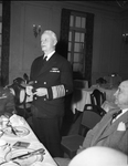 Adm. Nimitz. He is standing in front of a table in his military uniform and is holding an unidentifiable item in his hand while he talks. Amon Carter is shown in partial view seated at the table listening to Adm. Nimitz talk. On the table, there are empty plates of food with the cutlery on it, tea cups and napkins. In the background, there are divided lite windows with curtains, other tables and chairs in partial view .