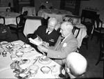 Adm. Nimitz and Amon Carter. Mr. Carter is wearing a suit and tie while Adm. Nimitz is in his military uniform. They are both seated at a table with plates of food in font of them and are viewing a document together. There is a partial view of an unidentified man's head. In the background, there are other tables and chair with cutlery and napkins.