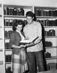 The Odessa High School football team is preparing for the upcoming quarterfinals game against Wichita Falls, Saturday. Pictured reading in the library during study hall are Hayden Fry and Peggy Rich. Fry is Bronchos' super "T" formation quarterback. The star senior is a big reason why Odessa has posted a perfect season so far. They are undefeated and with no turnovers. Fry is dressed in button-up shirt and jeans. Miss Rich is wearing a collared blouse, sweater, and a plaid skirt. The Odessa Bronchos went on to win the 1946 Texas State Championship.