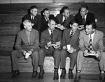 The second annual District 3-AA football banquet is being held in Sweetwater, Texas. The guest of honor is Coach Jess Neely. He is the head coach of Orange Bowl bound Rice University. Sitting in the bleachers, left to right, on the front row are John Dibrell, Coach Neely, Pat Gerald, and Von Rhea Beane. On the back row are Jim Neill, Pete Shotwell, Clayton Hopkins, and Barnes Milam. Mr. Dibrell, of Big Spring, Texas, is wearing a tweed suit. Coach Neely is dressed in a three-piece suit. Mr. Gerald, of Sweetwater, is wearing a three-piece, pinstripe suit. Mr. Beane, of San Angelo, Texas, is dressed in a light-colored suit. Mr. Neill, of Lamesa, Texas, is wearing a pinstripe suit. Mr. Shotwell, of Abilene, Texas, is dressed in a dark suit. Mr. Hopkins, is the Athletic Director in Odessa, Texas. He is wearing a pinstripe suit. Mr. Milam, of Midland, Texas, is dressed in a dark suit. The coaches are shown enjoying drinks and plates of food while they talk about football.