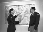 The 8th Air Force is headquartered at the Fort Worth Army Air Field (F. W. A. A. F.). Pictured in a briefing session, left to right, are Colonel James C. Selser and Colonel J. D. Ryan. Colonel Selser, commanding officer of the 43rd Group, is demonstrating the route traveled by B-29 airplanes from Fort Worth, Texas to Europe. The planes rendezvoused with fighter planes over the American occupation zone in Germany. Colonel Ryan is the plans officer of the reactivated 8th Air Force. Both men are dressed in their military uniforms. Published in The Fort Worth Star-Telegram Morning Edition December 10, 1946.
