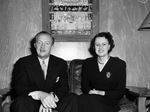 The Texas Sheep & Goat Raisers Association is holding their annual convention in Fort Worth, Texas. Early arrivals, are Mr. and Mrs. Curt Forstmann. Mr. Forstmann is president of the Forstmann Woolen Company in Passaic, New Jersey, one of the largest firms buying Texas wool. He is smoking a cigarette and dressed in a dark suit. Mrs. Forstmann is wearing a blouse, skirt, and a brooch. Published in The Fort Worth Star-Telegram Morning Edition December 10, 1946.