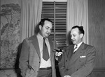 The Texas Sheep & Goat Raisers Association is holding their annual convention in Fort Worth, Texas. In attendance, left to right, are Vestel Askew and J. M. Jones. They are discussing plans designed to improve the wool market. Mr. Askew, of San Angelo, Texas, is the secretary of the Association. He is smoking a pipe, dressed in a suit. Mr. Jones, of Salt Lake City, Utah is secretary of the National Wool Growers' Association. He is wearing a double breasted suit. Published in The Fort Worth Star-Telegram Evening Edition December 10, 1946.