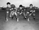 The Odessa High School football team will face off against the Jefferson Mustangs (San Antonio, Texas) in the Texas State Championship in Austin, Texas. Three key performers in the Bronchos' line left to right are tackle Steve Dowden, guard Harry Pace, and tackle Wayne Jones. They are shown in their starting positions, dressed in their football uniforms. The Odessa Bronchos went on to beat the Mustangs, winning the 1946 State Championship 21-14.