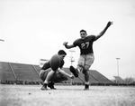 The Odessa High School football team will face off against the Jefferson Mustangs (San Antonio, Texas) in the Texas State Championship in Austin, Texas. One of the key pieces to a Bronchos victory is the kicking unit. Offensive star quarterback Hayden Fry is the holder and back Bryon Townsend is the straight-on kicker (27). They are shown practicing an extra-point. Both players are dress in their football uniforms. The Odessa Bronchos went on to beat the Mustangs, winning the 1946 State Championship 21-14.