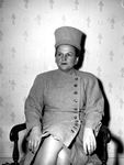 Mrs. W. B. Whitehead is shown sitting on a chair with her back to the wall. She is dressed in a tall hat and a dress with off-centered buttons. Published in The Fort Worth Star-Telegram Morning Edition December 11, 1946.