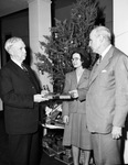 First Christian Church dinner party for blind persons. Reverend L. D. Anderson (left) presenting a gift to A. H. Gibson, president of the Citizens Association for the Blind. Miss Louise Scott looks on.