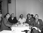 The Texas Sheep & Goat Raisers Association is holding their annual convention in Fort Worth, Texas. Gathering for breakfast at the Hotel Texas, left to right, are Joe Moore, Adolf Stieler, Percy Roberts, Jackson Hughes, and Jim Maddox. Mr. Moore is a Fort Worth sheep rancher. He is wearing a light suit. Mr. Stieler, of Comfort, Texas, is one of the biggest goat raisers in the world. He is dressed in a dark, three-piece suit. Mr. Roberts, of San Angelo, Texas, is wearing a button-up shirt and smoking a cigar. Mr. Hughes, also of San Angelo, is a wool buyer for Emery & Conant Company located in Boston, Massachusetts. He is dressed in a suit. Mr. Maddox, of Sweetwater, Texas, is sheep, goat, and cattle rancher. He is wearing a three-piece pinstripe suit. Published in The Fort Worth Star-Telegram Evening Edition December 11, 1946.
