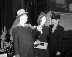 Mrs. Frances Gregg with her parents, Mr. and Mrs. Otto Campbell. She is to join her husband in Japan. Mrs. Gregg stands in between her parents and grins widely at her mother. Both Mr. and Mrs. Campbell have their arms around their daughter and appear to be smiling back at her, as well. Mr. Campbell is wearing a textured suit with a pair of eyeglasses and a brimmed hat. Both Mrs. Campbell and Mrs. Gregg are wearing buttoned up jackets and skirts with an accessory on their collars. They are also wearing hats. Mrs. Gregg holds her mother's waist as she carried two purses and a pair of gloves with her other hand. Mrs. Gregg's husband is Lieutenant A. J. Gregg Junior.