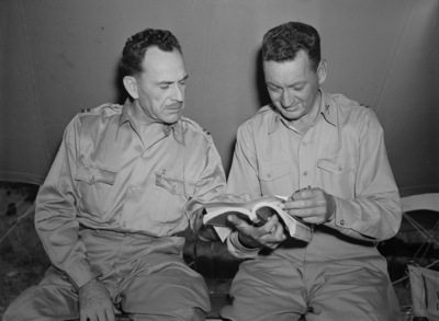 Texas National Guard maneuvers in Louisiana. Things are done strictly according to plan in troop maneuvers, with no guesswork. Looking over orders for the day, which tell the part their unit will play in the operation, are Captain Bulcher S. Tharp of Amarillo, Texas, commanding officer of the First Battalion, One Hundred and Thirty-first Field Artillery, at left, and Captain John L. Walton, battalion adjutant.