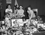 Collecting gifts for the United Public Health Service Hospital are Junior Red Cross members at E. M. Daggett Junior High School (from left) Johnny Cook, Ben Fortson and Wanda Balch. The three children are shown assembling a large collection of Christmas gifts gathered for patients at the United States Public Health Service Hospitals. Many of the gifts are wrapped and have bows tied around them. Wanda appears to be placing another gift to the pile while the other two are arranging a variety of apples.