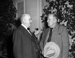 The Texas Sheep & Goat Raisers Association is holding their annual convention in Fort Worth, Texas. In attendance, left to right, are Joe G. Montague and John P. Lee. They are discussing problems in the cattle, lamb, and wool industries. Mr. Montague, of Fort Worth, is the general counsel for the Texas and Southwestern Cattle Raisers Association. He is smoking a pipe, dressed in a suit and bow tie. Mr. Lee, of San Angelo, Texas, is a former livestock superintendent of the Southwestern Exposition and Fat Stock Show. He is holding a cowboy hat and wearing a suit. Published in The Fort Worth Star-Telegram Evening Edition December 12, 1946.