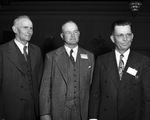 The Texas Sheep & Goat Raisers Association is holding their annual convention in Fort Worth, Texas. The newly elected officers in attendance, left to right, are Sayers Farmer, Bryan Hunt, and Clayton Puckett. Mr. Farmer, of Junction, Texas, is the second vice president. He is wearing a three-piece suit. Mr. Hunt, of Sonora, Texas, is the president. He is dressed in a three-piece suit. Mr. Puckett, of Fort Stockton, Texas, is the first vice president. He is wearing a double breasted suit. Published in The Fort Worth Star-Telegram Morning Edition December 13, 1946.