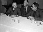 Officials are preparing for the 1947 Golden Gloves District and State Tournament. Sitting at a table, left to right, are Dr. Eugene Brown, Sully Montgomery, and Woody Taylor. Dr. Brown, chief judge, is wearing a double breasted suit. Mr. Montgomery, chief referee, is dressed in a suit. Mr. Taylor, tournament supervisor, is wearing a pinstripe suit.